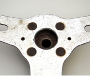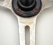 ここからは推論ですが、1965年前後にRSCより革巻きステアリングの製作依頼を受けたマッハを製造していた会社が、当初は急いでボスを作らなくてもステアリングをエスに装着できるようにとホンダ純正のエス用のスチール製ボス部のピッチに合わせてステアリングを製作したのが始まりだったのではないでしょうか。(市販されたエス用のステアリング用にはちゃんとアルミ削り出しのボスが用意されていました。)