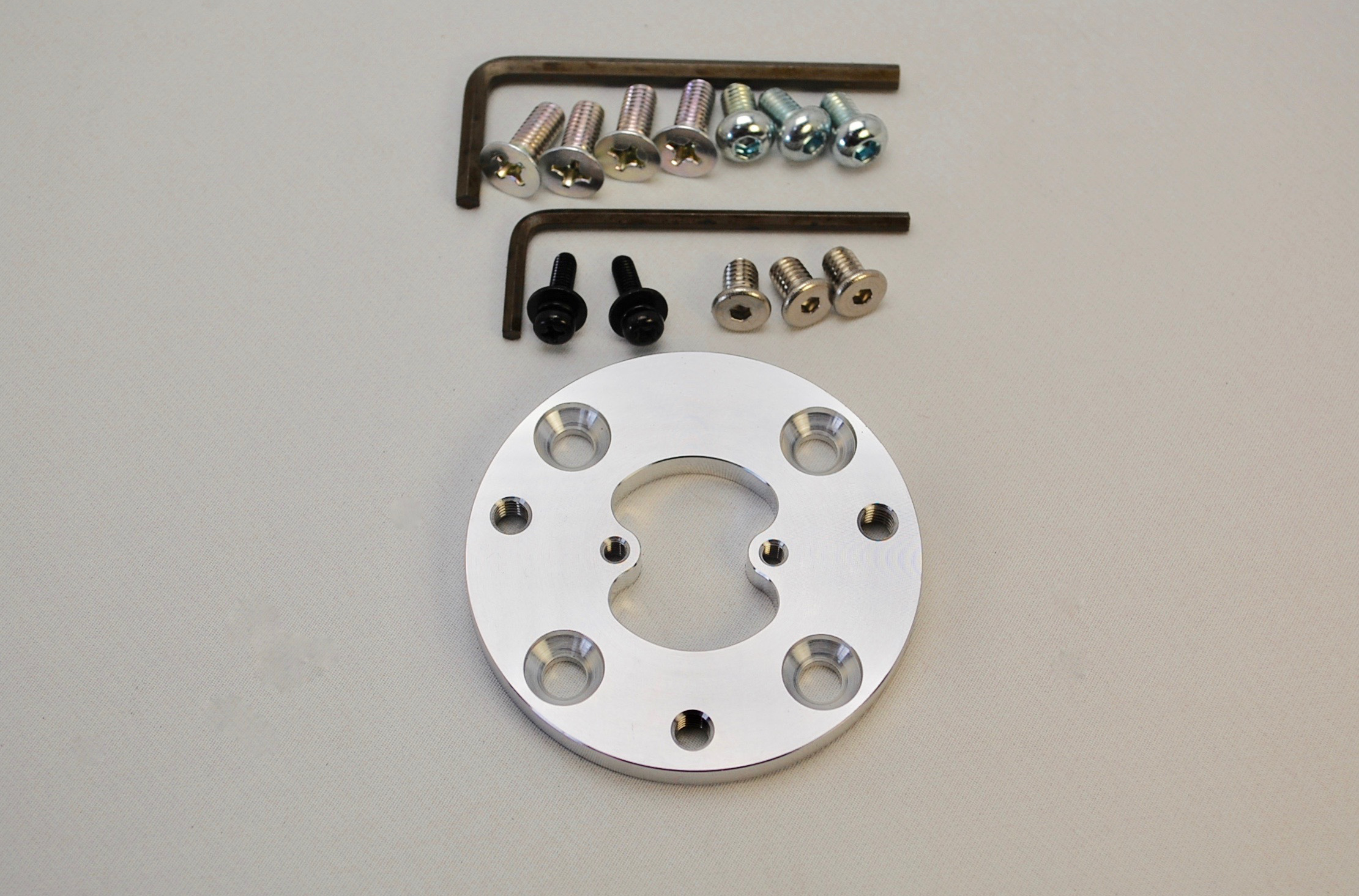 装着には別売の専用アダプターかお手持ちのマッハ・チェックマンステアリング用のボスに穴開け&M6ネジ切り加工かステアリングホイール自体にボス穴に合わせた穴開け加工が必要です。