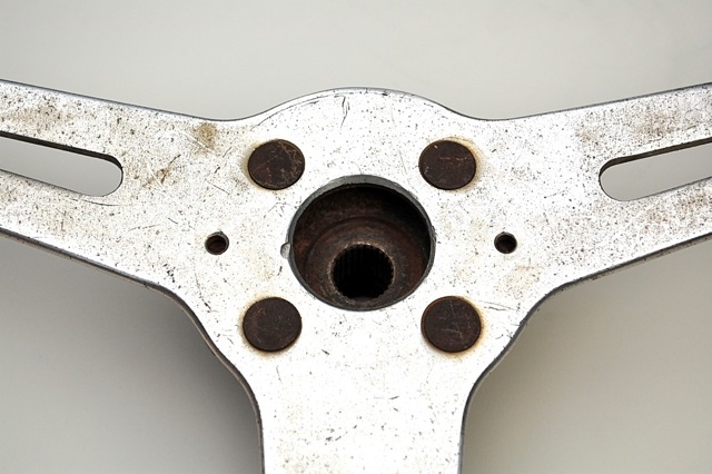 ここからは推論ですが、1965年前後にRSCより革巻きステアリングの製作依頼を受けたマッハを製造していた会社が、当初は急いでボスを作らなくてもステアリングをエスに装着できるようにとホンダ純正のエス用のスチール製ボス部のピッチに合わせてステアリングを製作したのが始まりだったのではないでしょうか。(市販されたエス用のステアリング用にはちゃんとアルミ削り出しのボスが用意されていました。)